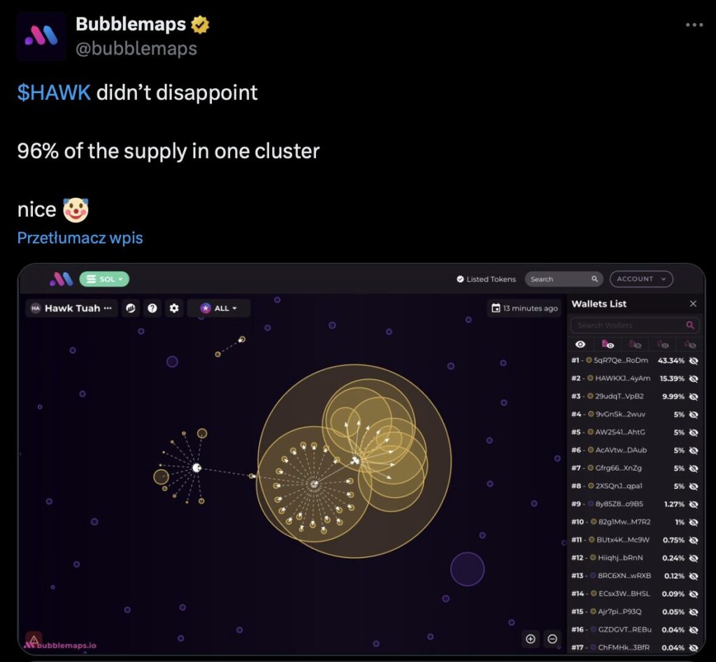 Oszustwo zaczęło wychodzić na jaw, gdy użytkownik Twittera Bubble Maps opublikował grafikę, która pokazywała, że 96% podaży tokena było kontrolowane przez zespół projektu i przekazywane do wielu mniejszych portfeli. Taki rozkład wskazywał, że tokeny mogły zostać szybko sprzedane, co negatywnie wpłynęłoby na wartość rynkową. Odkrycie Bubble Maps były początkiem ujawnienia zakulisowych działań projektu – poniżej wrzucam jeden ss, jednak zalecam zapoznać się na profilu @bubblemaps (platforma X) z całą analizą: