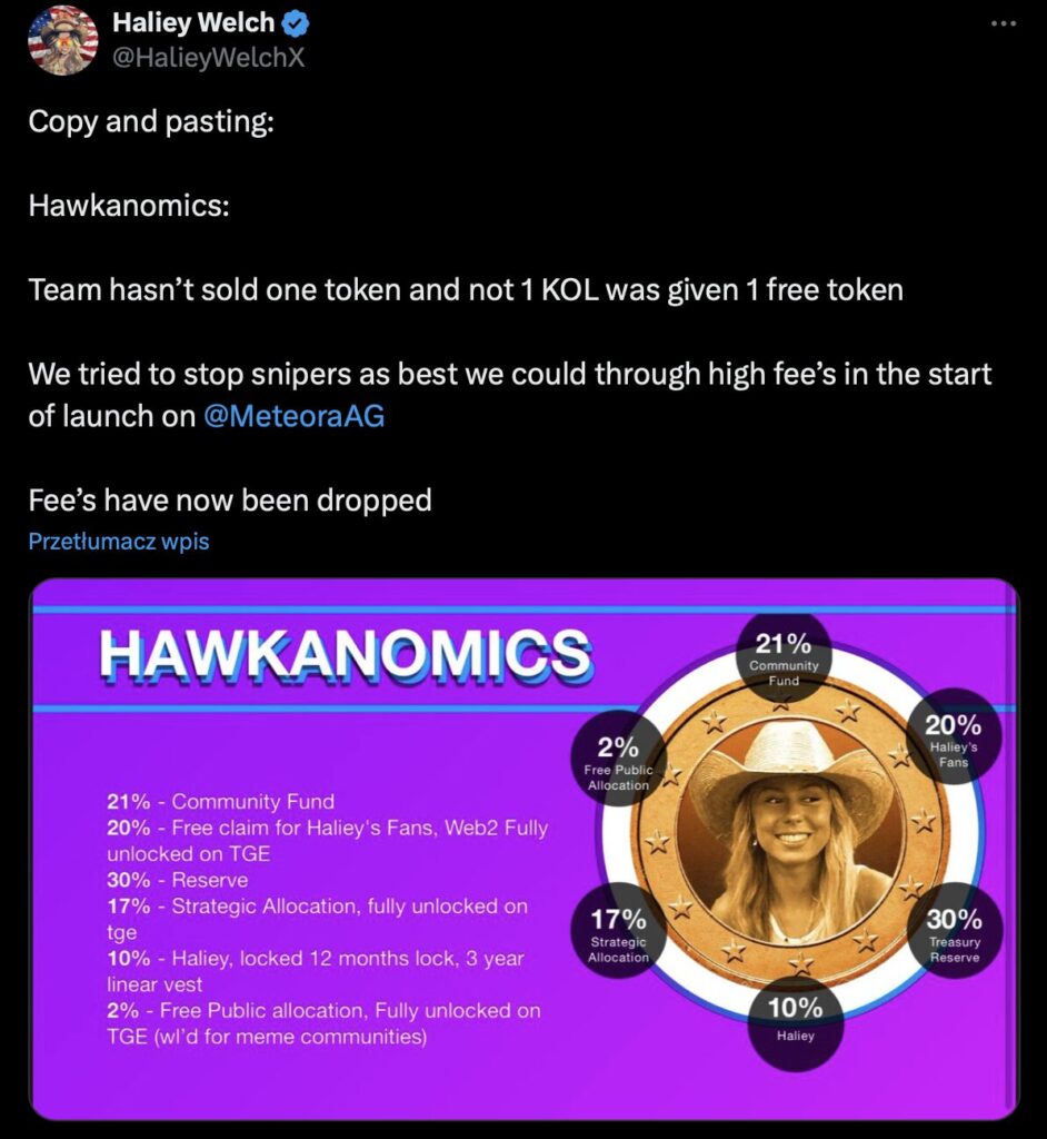 - Agresywna promocja – Haliey i inne osoby zaangażowane w projekt promowały token jako „rewolucyjny” i „szansę na wejście do świata kryptowalut”. Kierowano ofertę głównie do fanów Haley, którzy często nie mieli doświadczenia w kryptowalutach.