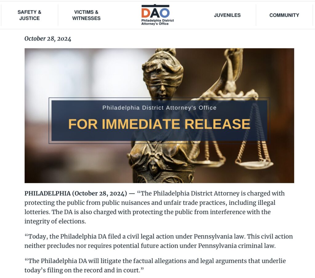 28 października, ,,The Philadelphia District Attorney” złożyła pozew przeciwko Elonowi Muskowi, oskarżając go o naruszenie prawa wyborczego poprzez kupowanie głosów. Pozew skupia się głównie na kontrowersyjnych działaniach Muska, takich jak loteria z nagrodą miliona dolarów dla osób podpisujących petycję popierającą Pierwszą i Drugą Poprawkę do Konstytucji USA.